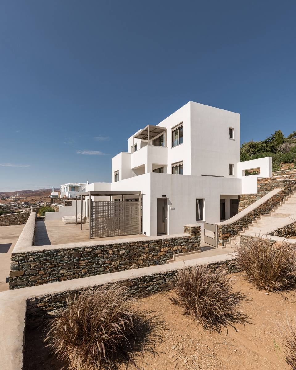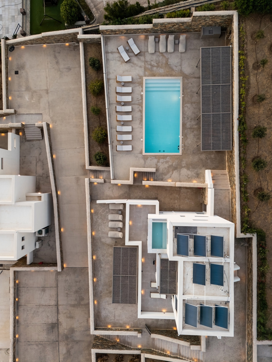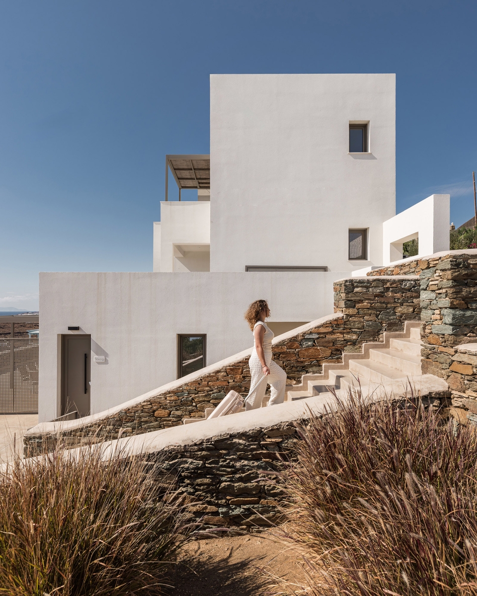 Each level of the villa is a white canvas, highlighting the signature sea views and using a playful geometry to allow a visual flow among the spaces. Wood, stone, and concrete, set the tone for the minimal ambience of Blue Grès, that features a soft grieze palette and build-in elements that reflect deep island roots.