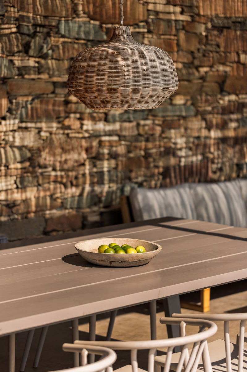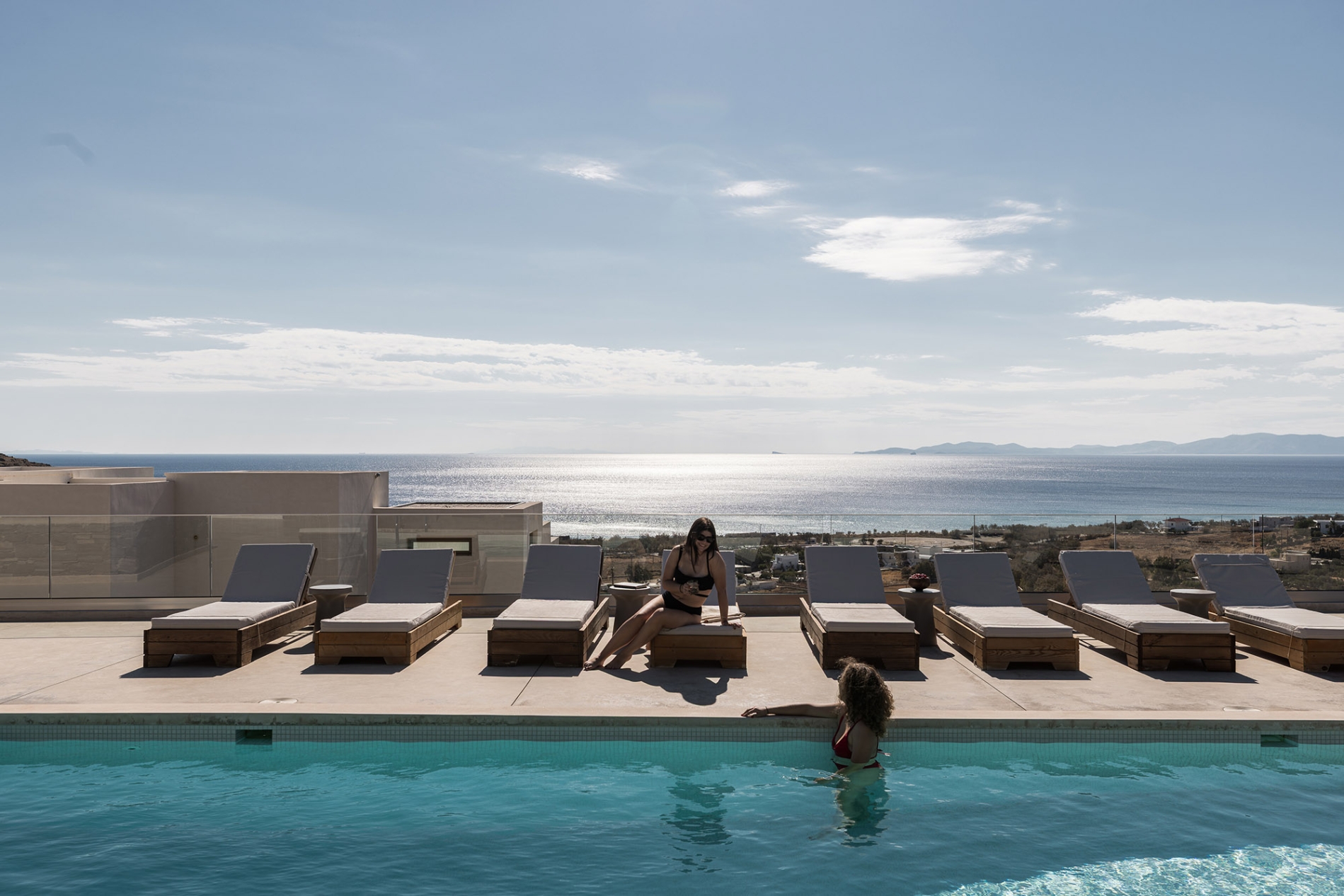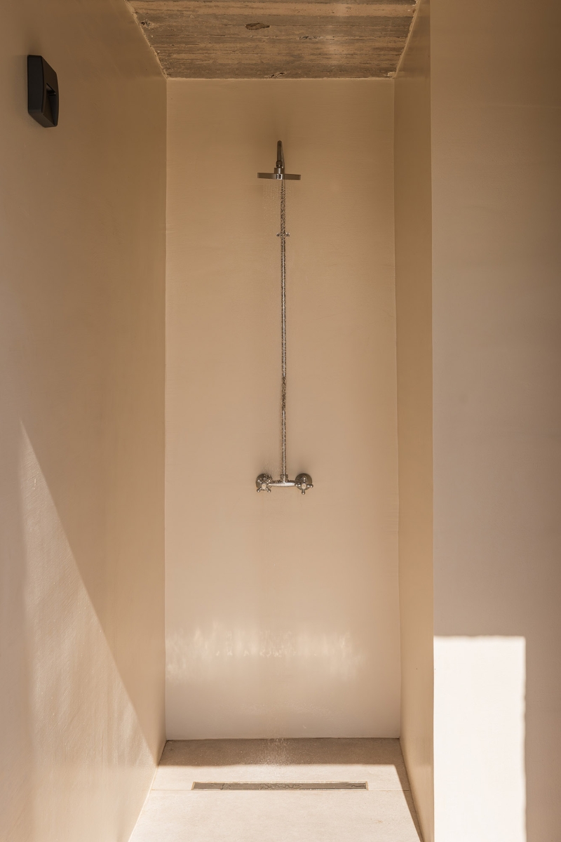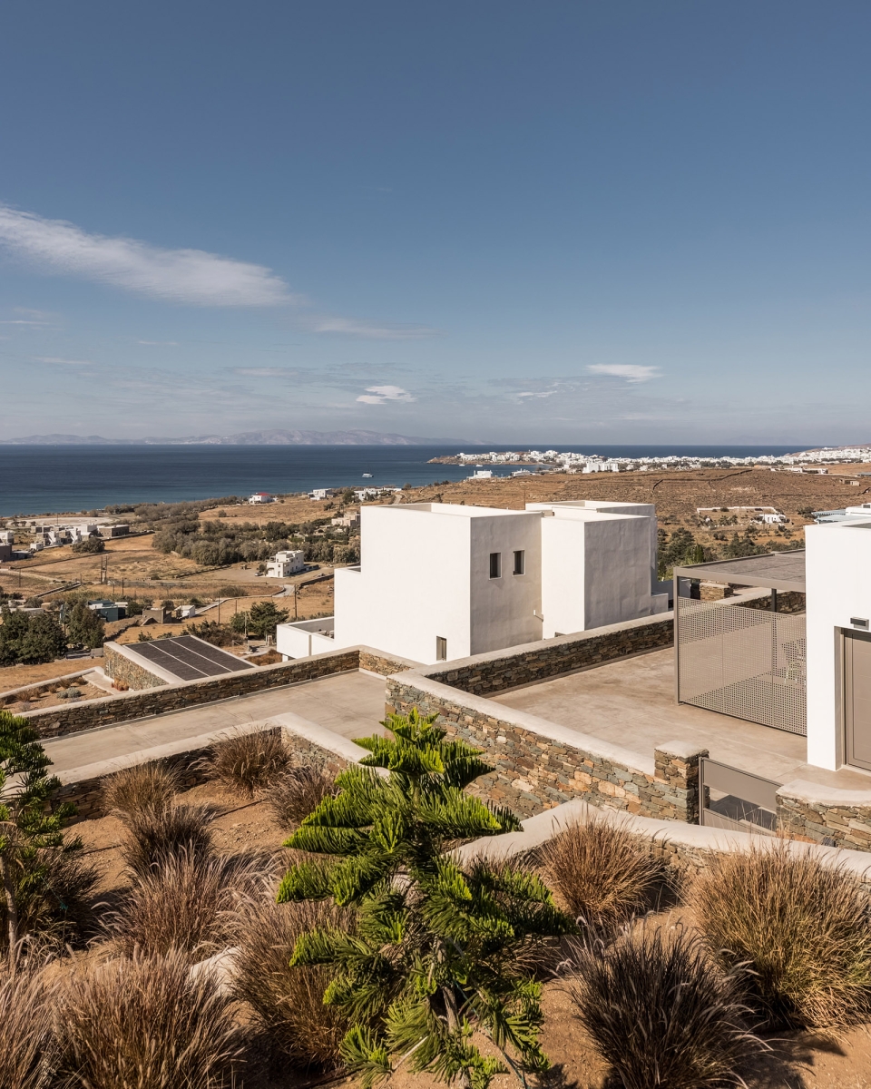 Each level of the villa is a white canvas, highlighting the signature sea views and using a playful geometry to allow a visual flow among the spaces. Wood, stone, and concrete, set the tone for the minimal ambience of Blue Grès, that features a soft grieze palette and build-in elements that reflect deep island roots.